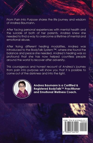 From Pain Into Purpose shares the life journey and wisdom of Andrea Baumann. After facing personal experiences with mental health and the suicide of both of her parents, Andrea knew she needed to find a way to overcome a lifetime of mental and emotional abuse. After trying different healing modalities, Andrea was introduced to the BodyTalk System (TM), where she found the balance and peace she needed. Andrea's healing was so profound that she has now helped countless people around the world to recover after adversity. This courageous and honest recount of Andrea's journey from pain into purpose will show you that it is possible to come out of the darkness and into the light.