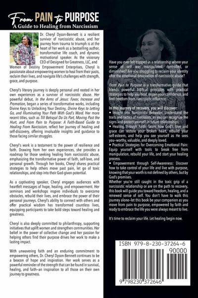 From Pain to Purpose: A Guide to Healing from Narcissism Have you ever felt trapped in a relationship where your sense of self was manipulated, controlled, or diminished? Are you struggling to reclaim your identity after the emotional devastation of narcissistic abuse? From Pain to Purpose is a transformative guide that blends powerful biblical principles with practical strategies to help you heal, regain your confidence, and find freedom from narcissistic influence. In this faith-based journey of recovery, you will discover:Insight into Narcissistic Behavior: Understand the traits and tactics of narcissists, so you can recognize the signs and protect yourself in future relationships. Healing through Faith: Learn how God's love and grace can restore your broken heart, rebuild your self-esteem, and help you see yourself as He sees you-worthy, valuable, and deeply loved. Practical Strategies for Overcoming Emotional Pain: Equip yourself with tools to break free from manipulation, rebuild your life, and start your healing process. Empowerment through Self-Awareness: Discover how to take control of your life and live with purpose, knowing that your worth is not defined by others, but by God's promises. Whether you're still caught in the toxic grip of a narcissistic relationship or are on the path to recovery, this book will guide you toward freedom, healing, and a renewed sense of self. You don't have to walk this journey alone-let this book be your companion as you move from pain to purpose, empowered by faith and ready to embrace the life you were always meant to live. It's time to reclaim your life. Let healing begin now.