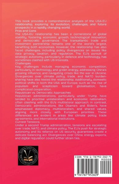 This book provides a comprehensive analysis of the USA-EU relationship, exploring its evolution, challenges, and future prospects in a rapidly changing world.Pros and ConsThe USA-EU relationship has been a cornerstone of global stability, fostering economic growth, technological innovation, and democratic governance. The transatlantic trade and investment partnership remains one of the world's largest, benefiting both economies. However, the relationship has also faced challenges, including policy divergences on issues like data privacy, taxation, and regulation. The EU's pursuit of strategic autonomy, particularly in defence and technology, has sometimes clashed with US interests.ChallengesKey challenges include managing economic competition, particularly in technology and green energy, addressing China's growing influence, and navigating crises like the war in Ukraine. Divergences over climate policy, trade, and NATO burden-sharing have also tested the relationship. Additionally, domestic political shifts in both the USA and Europe, such as the rise of populism and scepticism toward globalisation, have complicated cooperation.Republican vs. Democratic ApproachesRepublican administrations, particularly under Trump, have tended to prioritise unilateralism and economic nationalism, often clashing with the EU's multilateral approach. In contrast, Democratic administrations, like Obama's and Biden's, have emphasised diplomacy, multilateralism, and shared values, aligning more closely with European priorities. These differences are evident in areas like climate policy, trade agreements, and international institutions.Current TensionsUnder a second Trump administration, tensions are escalating over trade, NATO, and climate policy. The EU's push for strategic autonomy and its reliance on US security guarantees create a delicate balancing act. Divergences over China, energy exports, and digital regulation could further strain ties.