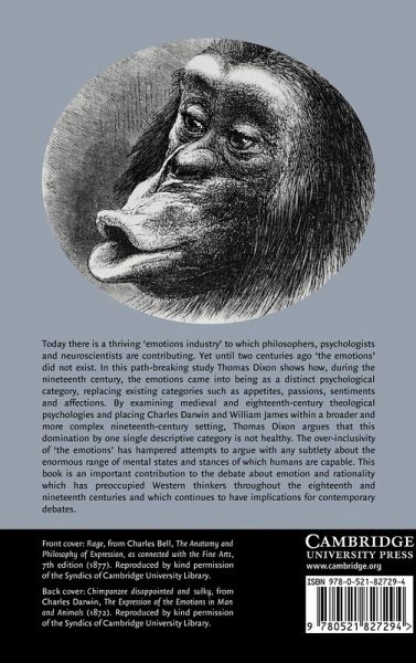 Until two centuries ago "the emotions" did not exist. Thomas Dixon reveals in this study how emotions came into being as a distinct psychological category. They replaced such concepts as appetites, passions, sentiments and affections, which had preoccupied thinkers as diverse as Augustine, Aquinas, Hume, and Darwin. The book is a significant original contribution to the debate which has preoccupied western thinkers across many disciplines in recent decades.