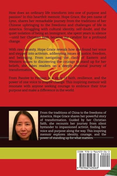 What does it take to transform silence into action, passivity into passion, and faith into courage? In this deeply personal and inspiring memoir, Hope Grace, the pen name of Lynn, chronicles her journey from the bustling streets of China to the heart of America, where she discovered her voice as an advocate for freedom, justice, and faith. Raised in a culture that often valued conformity over individuality, Hope Grace's early life was shaped by traditions, expectations, and unspoken rules. Her immigration to the United States brought a new set of challenges, as she grappled with cultural adaptation, self-doubt, and the quiet alienation of being a stranger in a foreign land. For years, she remained a passive observer, feeling invisible in the face of the world's complexities. But as the social and political climate shifted, so did she. Guided by her growing Christian faith, Hope Grace shares the pivotal moments that sparked her transformation-from awakening to the realities of political freedoms in America to finding courage in her faith and in the stories of others who dared to stand up for what they believed. With raw honesty and a profound sense of purpose, she recounts the trials, triumphs, and deeply personal realizations that fueled her evolution from silent bystander to impassioned activist. From Passive to Passion is more than just a memoir; it's a testament to the power of personal responsibility, faith, and the belief that even the quietest voice can make an impact. Hope Grace weaves her life's story with reflections on identity, belonging, Christian faith, and the universal struggle to stand for something bigger than oneself. Whether you're an immigrant seeking inspiration, a person of faith looking for encouragement, an advocate searching for connection, or simply a reader curious about the human capacity for change, this memoir will resonate deeply. Through Hope Grace's candid and compelling narrative, you'll be reminded of the resilience of the human spirit and the importance of finding and using your voice-no matter where you start. Let this story of faith, transformation, and courage ignite your passion to make a difference.