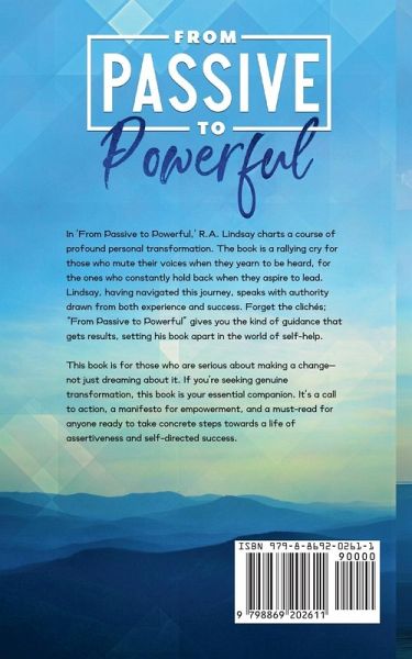Step out of the background and seize control of your life with "From Passive to Powerful." This is the book for those who've felt overlooked, for voices muted by uncertainty, and for anyone ready to live boldly. Author, R.A. Lindsay presents a riveting guide that transcends the typical self-help book, offering a practical roadmap to self-empowerment and assertiveness. Drawing from his own journey of transformation, Lindsay provides the tools you need to challenge the habits of passivity and embrace a life of confidence and success. Through relatable examples and proven strategies, "From Passive to Powerful" equips you to: - Recognize and dismantle the barriers to self-assurance. - Develop the skills to assert your opinions and needs confidently. - Build a foundation of strong self-esteem that withstands external pressures. This book isn't just about finding your voice; it's about amplifying it in every aspect of your life. It's a commitment to change, a workbook for growth, and a companion on the path to becoming the powerful individual you are meant to be. Volume 1 of a transformative series, "From Passive to Powerful" is the first step toward a life where you lead, not follow. Don't wait any longer to turn the page; your most empowered self is waiting to emerge.