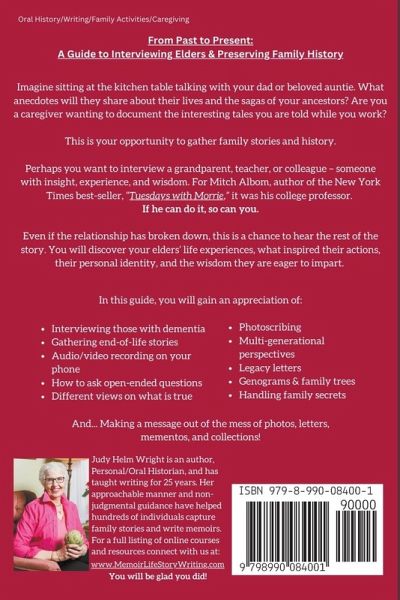 Imagine sitting at the kitchen table talking with your dad or beloved auntie. What anecdotes will they share about their lives and the sagas of your ancestors? Are you a caregiver wanting to document the interesting tales you are told while you work? This is your opportunity to gather family stories and history. Perhaps you want to interview a grandparent, teacher, or colleague - someone with insight, experience, and wisdom. For Mitch Albom, author of the New York Times best-seller, "Tuesdays with Morrie," it was his college professor. If he can do it, so can you. Even if the relationship has broken down, this is a chance to hear the rest of the story. You will discover your elders' life experiences, what inspired their actions, their personal identity, and the wisdom they are eager to impart. In this guide, you will gain an appreciation of:Interviewing those with dementia Gathering end-of-life stories Audio/video recording on your phone How to ask open-ended questions Different views on what is true Photoscribing Multi-generational perspectives Legacy letters Genograms & family trees Handling family secrets And... Making a message out of the mess of photos, letters, mementos, and collections! To help facilitate your story-gathering process, we have included space for your personal notes and reflections. 175 pages At Artichoke Press, our underlying message is "Finding the heart of the story in the journey of life." Judy Helm Wright is an Author/Personal & Oral Historian, and has taught writing for 25 years. Her approachable manner and non-judgmental guidance have helped hundreds of individuals capture family stories and write memoirs.