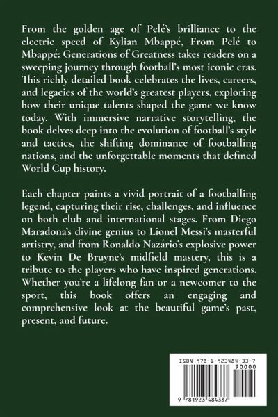 From the golden age of Pelé's brilliance to the electric speed of Kylian Mbappé, From Pelé to Mbappé: Generations of Greatness takes readers on a sweeping journey through football's most iconic eras. This richly detailed book celebrates the lives, careers, and legacies of the world's greatest players, exploring how their unique talents shaped the game we know today. With immersive narrative storytelling, the book delves deep into the evolution of football's style and tactics, the shifting dominance of footballing nations, and the unforgettable moments that defined World Cup history. Each chapter paints a vivid portrait of a footballing legend, capturing their rise, challenges, and influence on both club and international stages. From Diego Maradona's divine genius to Lionel Messi's masterful artistry, and from Ronaldo Nazário's explosive power to Kevin De Bruyne's midfield mastery, this is a tribute to the players who have inspired generations. Whether you're a lifelong fan or a newcomer to the sport, this book offers an engaging and comprehensive look at the beautiful game's past, present, and future.