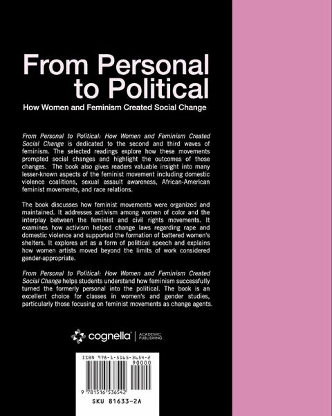 From Personal to Political: How Women and Feminism Created Social Change is dedicated to the second, third, and fourth waves of feminism. The selected readings explore how these movements prompted social changes and highlight the outcomes of those changes. The book also gives readers valuable insight into many lesser-known aspects of the feminist movement including domestic violence coalitions, sexual assault awareness, African American feminist movements, and current movements occurring throughout the country. The book discusses how feminist movements were organized and maintained. It addresses activism among women of color and the interplay between the feminist and civil rights movements. It examines how activism helped shape laws regarding rape and domestic violence and supported the formation of battered women's shelters. The book also explores creative forms of activism, including art, music, graffiti, and writings as a form of social change. Featuring updated images and information, From Personal to Political helps readers understand how feminism successfully turned the formerly personal into the political. It is an excellent choice for courses in women's and gender studies, particularly those focusing on feminist movements as change agents. JoAnna Wall earned both her juris doctorate and her master's degree in library and information science at the University of Oklahoma, Norman. She is now a lecturer in women's and gender studies at the university, where she teaches courses in women and the law, gender and international human rights law, divorce law, and the impact of women on social change.