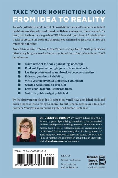 TAKE YOUR NONFICTION BOOK FROM IDEA TO REALITY Today’s publishing world is full of possibilities. From self-funded and hybrid models to working with traditional publishers and agents, there is a path for everyone. But how do you get there? Which road do you choose? And what does it take to prepare the pitch and proposal you will need to get the attention of a reputable publisher? From Pitch to Print: The Nonfiction Writer’s 10-Step Plan to Getting Published offers everything you need to know to go from idea to final printed book. You’ll learn how to: * Make sense of the book publishing landscape * Find out if you’re the right person to write a book * Lay the professional groundwork to become an author * Enhance your brand visibility * Write your query letter and design your pitch * Create a winning book proposal * Craft your ideal publishing roadmap * Make the pitch and get published * Includes a list of writing resources, a sample book proposal, and an exclusive offer to Dr. Jennifer Dorsey's book proposal course! By the time you complete this 10-step plan, you’ll have a polished pitch and book proposal that’s ready to submit to publishers, agents, and business partners. Your path to becoming a published author starts here. DR. JENNIFER DORSEY has worked in book publishing for over 25 years. Specializing in nonfiction, she has worked for both small presses and large national publishers in the history, tech, lifestyle, self-help, business, enthusiast, and professional development categories. She is a graduate of Saint Mary-of-the-Woods College and earned her M.A. and Ph.D. in rhetoric and composition at Saint Louis University.