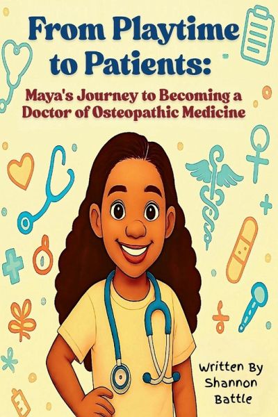 Follow Maya on her big dream to become a doctor from starting with a teddy bear checkup! From Playtime to Patients: Maya's Journey to Becoming a Doctor of Osteopathic Medicine By Shannon Battle, MPH - Future D.O. Illustrated with love and purpose Step into the inspiring world of Maya, a curious and compassionate young girl with big dreams of becoming a doctor. From bedtime checkups on teddy bears to mastering science in school and finally wearing her white coat with pride, From Playtime to Patients is a heartwarming journey that shows kids they can achieve anything with courage, kindness, and a little imagination. This beautifully illustrated, full-color hardcover book is more than a story. It's a celebration of Black girl joy, medical dreams, and representation in healthcare. Perfect for future doctors, dreamers, and families who believe in the power of possibility. Bonus coloring pages and fun activities are included to spark creativity and reinforce learning! Along the way, children will discover:What doctors really do How D.O.s care for the whole person; mind, body, and spirit The power of kindness, empathy, and imagination Perfect for kids of all ages, this inspiring story celebrates big dreams, big hearts, and the little steps that lead to meaningful futures. Whether your child is fascinated by doctors or just loves pretend play, Maya's journey will spark their imagination and remind them that every great future starts with a dream.