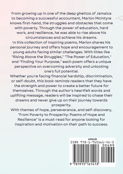 From growing up in one of the deep ghettos of Jamaica to becoming a successful accountant, Marlon McIntyre knows first-hand, the struggles and obstacles that come with poverty. Through the power of education, hard work, and resilience, he was able to rise above his circumstances and achieve his dreams. In this collection of inspiring poems, Marlon shares his personal journey and offers hope and encouragement to young adults facing similar challenges. With titles like "Rising Above the Struggles," "The Power of Education," and "Finding Your Purpose," each poem offers a unique perspective on overcoming adversity and unlocking one's full potential. Whether you're facing financial hardship, discrimination, or self-doubt, this book reminds readers that they have the strength and power to create a better future for themselves. Through the author's heartfelt words and uplifting message, readers will be inspired to chase their dreams and never give up on their journey towards prosperity. With themes of hope, perseverance, and self-discovery, "From Poverty to Prosperity: Poems of Hope and Resilience" is a must-read for anyone looking for inspiration and motivation on their path to success.
