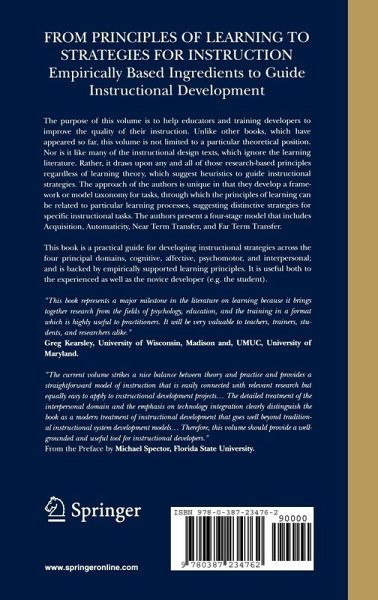 The purpose of this volume is to help educators and training developers to improve the quality of their instruction. Unlike other books, which have appeared so far, this volume is not limited to a particular theoretical position. Nor is it like many of the instructional design texts, which ignore the learning literature. Rather, it draws upon any and all of those research-based principles regardless of learning theory, which suggest heuristics to guide instructional strategies. The approach of the authors is unique in that they develop a framework or model taxonomy for tasks, through which the principles of learning can be related to particular learning processes, suggesting distinctive strategies for specific instructional tasks. The authors present a four-stage model that includes acquisition, automaticity, near term transfer, and far term transfer.