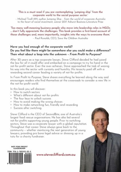 Have you had enough of the corporate world? Do you feel like there might be somewhere else you could make a difference? Then what about a leap into the unknown - From Profit to Purpose? After 30 years as a top corporate lawyer, Steve Clifford decided he had juiced the law for all it could offer and embarked on a campaign to try his hand in the not-for-profit sector. Ever the over-achiever, Steve approached the task of wooing his way into the sector with curiosity and humility. His tenacity paid off with a rewarding second career leading a variety of not-for-profits. In From Profit to Purpose, Steve shares everything he learned along the way and encourages readers who find themselves at the crossroads to consider a new life in the not-for-profit world. In this book you will discover:How to switch sectors What's different about not-for-profits The four keys to unlock success How to avoid making the wrong choices How to make networking fun, friendly and rewarding Success after switching.