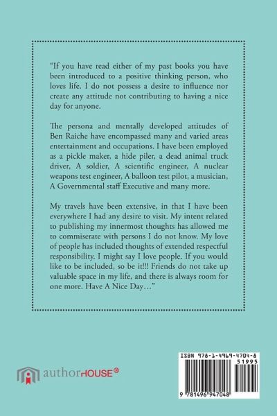 "If you have read either of my past books you have been introduced to a positive thinking person, who loves life. I do not possess a desire to influence nor create any attitude not contributing to having a nice day for anyone. The persona and mentally developed attitudes of Ben Raiche have encompassed many and varied areas entertainment and occupations. I have been employed as a pickle maker, a hide piler, a dead animal truck driver, A soldier, A scientific engineer, A nuclear weapons test engineer, A balloon test pilot, a musician, A Governmental staff Executive and many more. My travels have been extensive, in that I have been everywhere I had any desire to visit. My intent related to publishing my innermost thoughts has allowed me to commiserate with persons I do not know. My love of people has included thoughts of extended respectful responsibility. I might say I love people. If you would like to be included, so be it!!! Friends do not take up valuable space in my life, and there is always room for one more. Have A Nice Day..."