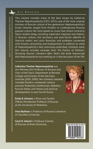 This volume offers readers an engaging collection of published and unpublished articles by Catherine Theimer Nepomnyashchy (1951-2015), one of the most original scholars of Russian culture of her generation. Nepomnyashchy's work speaks to issues that remain central to Slavic studies today, including imperialism in Russian culture; the resiliency and post-Soviet afterlife of Stalinist mythic and cultic formulas; and problems connected with dissent, censorship, and displacement.