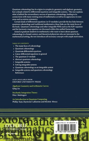 Quantum cohomology has its origins in symplectic geometry and algebraic geometry, but is deeply related to differential equations and integrable systems. This text explains what is behind the extraordinary success of quantum cohomology, leading to its connections with many existing areas of mathematics as well as its appearance in new areas such as mirror symmetry. Certain kinds of differential equations (or D-modules) provide the key links between quantum cohomology and traditional mathematics; these links are the main focus of the book, and quantum cohomology and other integrable PDEs such as the KdV equation and the harmonic map equation are discussed within this unified framework. Aimed at graduate students in mathematics who want to learn about quantum cohomology in a broad context, and theoretical physicists who are interested in the mathematical setting, the text assumes basic familiarity with differential equations and cohomology.