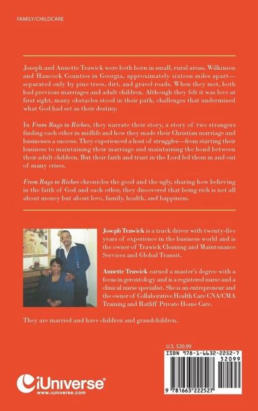 From Rags to Riches is the true story of two strangers who find each other in midlife and turn rags into riches and make their Christian marriage and businesses a success. Joseph and Annette Trawick were both born in small, rural areas, Wilkinson and Hancock Counties in Georgia, approximately sixteen miles apart-only separated by pine trees, dirt, and gravel roads. Both had previous marriages and have adult children. Although they felt it was love at first sight, there were many obstacles in their path that undermined what God had set as their destiny. There were many struggles, from starting their business to maintaining their marriage and maintaining the bond between their adult children. Throughout this book, they will take you on a journey of good and ugly. Believing in the faith of God and each other, they discovered that being rich is not all about money but about love, family, health, and happiness.