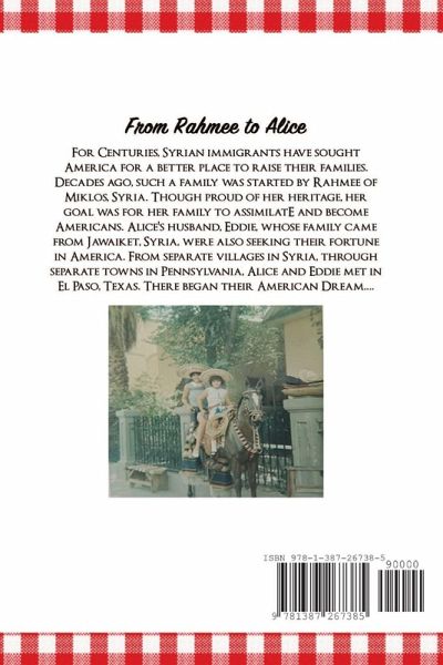 For Centuries, Syrian immigrants have sought America for a better place to raise their families. Decades ago, such a family was started by Rahmee of Miklos, Syria. Though proud of her heritage, her goal was for her family to assimilate and become Americans. Alice's husband, Eddie, whose family came from Jawaiket, Syria, were also seeking their fortune in America. From separate villages in Syria, through separate towns in Pennsylvania, Alice and Eddie met in El Paso, Texas. There began their American Dream...