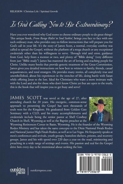 Are you looking for a book that will encourage, equip, challenge, and inspire you to live a more fruitful Christian life? If you haven't noticed, the world desperately needs YOU to be an effective servant of the Lord. And you absolutely can be, even if you have failed or doubted yourself in the past. The author, James Scott, wants you to know that you do not have to be a mega-church pastor, seminary graduate, or famous author to faithfully get the job done for God and help advance the Kingdom of Christ right where God has planted you. This unique book, "from RANGE RIDIN' to SOUL SEEKIN,'" showcases how a normal, everyday cowboy was called by God to spread the Gospel to the ends of the earth. As the title suggests, James wasn't born to any sort of prominent position in society. He was busy riding fences, roping cows, and living the "romantic," but mundane life of a cowboy in Wyoming and Montana. James got saved by God's grace, just like anyone else (details provided). But then James was set in motion by God in unimaginable ways. In this book, you will get a first-hand account of how God's call came into James' life, and how best to respond when God calls YOU to serve Him as well. Through trial and error, guidance from God, help from a mentor or two, and plenty of Bible doing (different from mere Bible "study"), James has mastered the art of loving and reaching people for Christ. He addresses many of the big questions in life, such as: calling, purpose, mission, and Kingdom. But he also provides pinpoint, incredibly practical advice on evangelism and discipleship. So many other books on the topic just provide generic, one-size-fits-all treatment of the Great Commission. James, in contrast, gives separate and detailed instructions on how best to witness to your family, friends, casual acquaintances, and then total strangers. James provides many stories, all completely true and unembellished, about his experiences in the trenches