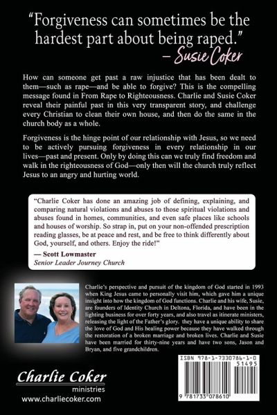 How can someone get past a raw injustice that has been dealt to them-such as rape-and be able to forgive? This is the compelling message found in From Rape to Righteousness. Charlie and Susie Coker reveal their painful past in this very transparent story, and challenge every Christian to clean their own house, and then do the same in the church body as a whole. Forgiveness is the hinge point of our relationship with Jesus, so we need to be actively pursuing forgiveness in every relationship in our lives-past and present. Only by doing this can we truly find freedom and walk in the righteousness of God-only then will the church truly reflect Jesus to an angry and hurting world.