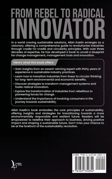 "A book for the businesses of tomorrow" THE EUROPEAN; CLIMATE CHANGE REVIEW From Rebel to Radical Innovator: Leading the Transformation through Circularity by Albin Kaelin In a world craving sustainable solutions, Albin Kaelin emerges as a visionary, offering a comprehensive guide to revolutionize industries through cradle-to-cradle and circularity principles. With over three decades of expertise and honored with thirty global management awards, he has developed a book to unveil a blueprint for change management, management tools and innovation. Here's what this book offers:Gain insights from an award-winning expert with thirty years of experience in sustainable industry practices. Learn how to transition industries from linear to circular thinking for long-term environmental and economic benefits. Discover strategies to transform management systems and foster radical innovation. Explore the transformation of industries from rebellious to pioneering forces for change. Understand the importance of involving consumers in the journey towards sustainability. Albin Kaelin's book embodies the core principles of sustainability, offering insights and strategies for transitioning towards a more environmentally responsible and resilient future. Readers will be empowered to redefine their approach to business, driving positive impact and shaping a sustainable future. Don't miss your chance to be at the forefront of the sustainability revolution.