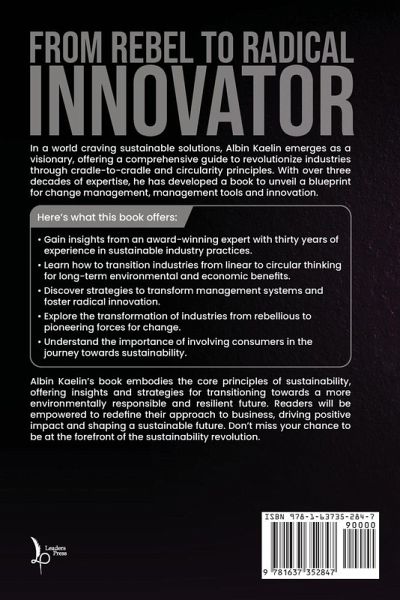 "A book for the businesses of tomorrow" THE EUROPEAN; CLIMATE CHANGE REVIEW From Rebel to Radical Innovator: Leading the Transformation through Circularity by Albin Kaelin In a world craving sustainable solutions, Albin Kaelin emerges as a visionary, offering a comprehensive guide to revolutionize industries through cradle-to-cradle and circularity principles. With over three decades of expertise and honored with thirty global management awards, he has developed a book to unveil a blueprint for change management, management tools and innovation. Here's what this book offers:Gain insights from an award-winning expert with thirty years of experience in sustainable industry practices. Learn how to transition industries from linear to circular thinking for long-term environmental and economic benefits. Discover strategies to transform management systems and foster radical innovation. Explore the transformation of industries from rebellious to pioneering forces for change. Understand the importance of involving consumers in the journey towards sustainability. Albin Kaelin's book embodies the core principles of sustainability, offering insights and strategies for transitioning towards a more environmentally responsible and resilient future. Readers will be empowered to redefine their approach to business, driving positive impact and shaping a sustainable future. Don't miss your chance to be at the forefront of the sustainability revolution.