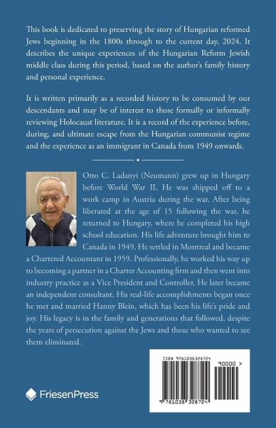 Otto C. Ladanyi (Neumann) grew up in Hungary before World War II. He was shipped off to a work camp in Austria during the war. After being liberated at the age of 15 following the war, he returned to Hungary, where he completed his high school education. His life adventure brought him to Canada in 1949. He settled in Montreal and became a Chartered Accountant in 1959. Professionally, he worked his way up to becoming a partner in a Charter Accounting firm and then went into industry practice as a Vice President and Controller. He later became an independent consultant. His real-life accomplishments began once he met and married Hanny Blein, which has been his life's pride and joy. His legacy is in the family and generations that followed, despite the years of persecution against the Jews and those who wanted to see them eliminated.