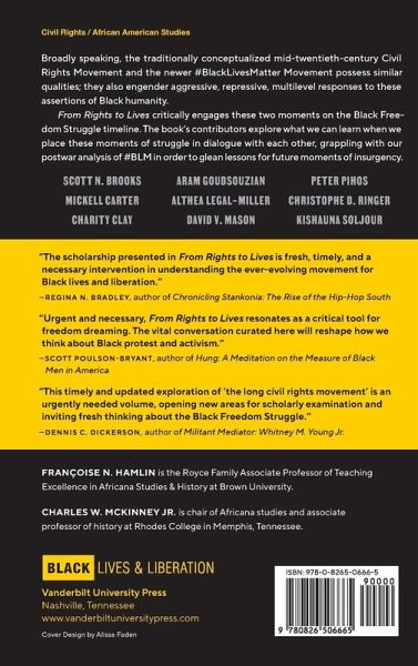 Broadly speaking, the traditionally conceptualized mid-twentieth-century Civil Rights Movement and the newer #BlackLivesMatter Movement possess some similar qualities. They both represent dynamic, complex moments of possibility and progress. They also share mass-based movement activities, policy/legislative advocacy, grassroots organizing, and targeted media campaigns. Innovation, growth, and dissension-core aspects of movement work-mark them both. Crucially, these moments also engender aggressive, repressive, multilevel responses to these assertions of Black humanity. From Rights to Lives critically engages the dynamic relationship between these two moments of liberatory possibility on the Black Freedom Struggle timeline. The book's contributors explore what we can learn when we place these moments of struggle in dialogue with each other. They grapple with how our understanding of the postwar moment shapes our analysis of #BLM and wherein lie the discontinuities, in order to glean lessons for future moments of insurgency.