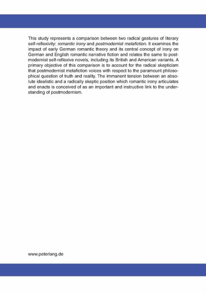This study represents a comparison between two radical gestures of literary self-reflexivity: romantic irony and postmodernist metafiction. It examines the impact of early German romantic theory and its central concept of irony on German and English romantic narrative fiction and relates the same to postmodernist self-reflexive novels, including its British and American variants. A primary objective of this comparison is to account for the radical skepticism that postmodernist metafiction voices with respect to the paramount philosophical question of truth and reality. The immanent tension between an absolute idealistic and a radically skeptic position which romantic irony articulates and enacts is conceived of as an important and instructive link to the understanding of postmodernism.