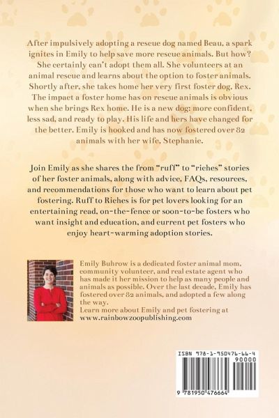 After impulsively adopting a rescue dog named Beau, a spark ignites in Emily to help save more rescue animals. But how? She certainly can't adopt them all. She volunteers at an animal rescue and learns about the option to foster animals. Shortly after, she takes home her very first foster dog, Rex. The impact a foster home has on rescue animals is obvious when she brings Rex home. He is a new dog: more confident, less sad, and ready to play. His life and hers have changed for the better. Emily is hooked and has now fostered over 60 animals with her wife, Stephanie. Join Emily as she shares the from "ruff" to "riches" stories of her foster animals, along with advice, FAQs, resources, and recommendations for those who want to learn about pet fostering. Ruff to Riches is for pet lovers looking for an entertaining read, on-the-fence or soon-to-be fosters who want insight and education, and current pet fosters who enjoy heart-warming adoption stories.