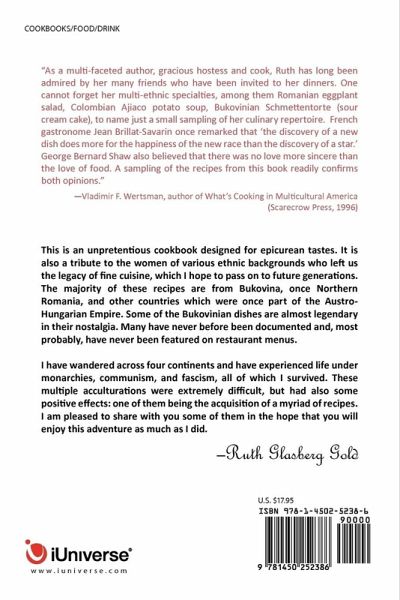 ¿As a multi-faceted author, gracious hostess and cook, Ruth has long been admired by her many friends who have been invited to her dinners. One cannot forget her multi-ethnic specialties, among them Romanian eggplant salad, Colombian Ajiaco potato soup, Bukovinian Schmettentorte (sour cream cake), to name just a small sampling of her culinary repertoire. French gastronome Jean Brillat-Savarin once remarked that ¿the discovery of a new dish does more for the happiness of the new race than the discovery of a star.¿ George Bernard Shaw also believed that there was no love more sincere than the love of food. A sampling of the recipes from this book readily confirms both opinions.¿ ¿Vladimir F. Wertsman, author of What¿s Cooking in Multicultural America (Scarecrow Press, 1996) This is an unpretentious cookbook designed for epicurean tastes. It is also a tribute to the women of various ethnic backgrounds who left us the legacy of fine cuisine, which I hope to pass on to future generations. The majority of these recipes are from Bukovina, once Northern Romania, and other countries which were once part of the Austro-Hungarian Empire. Some of the Bukovinian dishes are almost legendary in their nostalgia. Many have never before been documented and, most probably, have never been featured on restaurant menus. I have wandered across four continents and have experienced life under monarchies, communism, and fascism, all of which I survived. These multiple acculturations were extremely difficult, but had also some positive effects: one of them being the acquisition of a myriad of recipes. I am pleased to share with you some of them in the hope that you will enjoy this adventure as much as I did. ¿Ruth Glasberg Gold