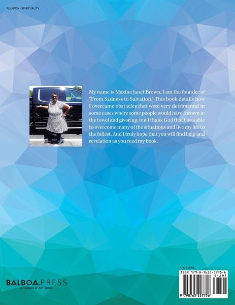 My name is Maxine Janet Brown, I am the founder of "From Sadness to Salvation." This book details how I overcame obstacles that were very detrimental in some cases where some people would have thrown in the towel and given up, but I thank God that I was able to overcome many of the situations and live my life to the fullest. And I truly hope that you will find help and revelation as you read my book.