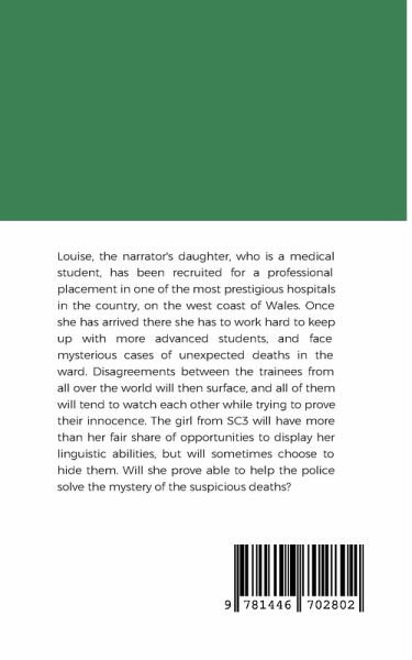 Louise, the narrator's daughter, who is a medical student, has been recruited for a professional placement in one of the most prestigious hospitals in the country, on the west coast of Wales. Once she has arrived there she has to work hard to keep up with more advanced students, and face mysterious cases of unexpected deaths in the ward. Disagreements between the trainees from all over the world will then surface, and all of them will tend to watch each other while trying to prove their innocence. The girl from SC3 will have more than her fair share of opportunities to display her linguistic abilities, but will sometimes choose to hide them. Will she prove able to help the police solve the mystery of the suspicious deaths?