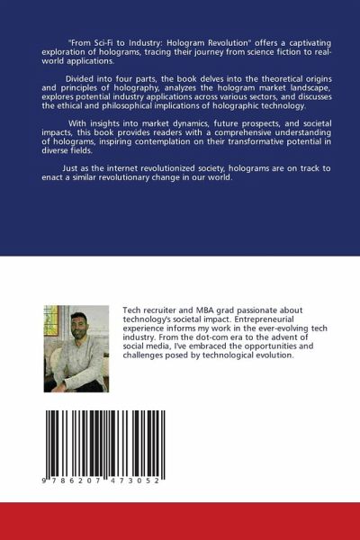 "From Sci-Fi to Industry: Hologram Revolution" offers a captivating exploration of holograms, tracing their journey from science fiction to real-world applications. Divided into four parts, the book delves into the theoretical origins and principles of holography, analyzes the hologram market landscape, explores potential industry applications across various sectors, and discusses the ethical and philosophical implications of holographic technology. With insights into market dynamics, future prospects, and societal impacts, this book provides readers with a comprehensive understanding of holograms, inspiring contemplation on their transformative potential in diverse fields. Just as the internet revolutionized society, holograms are on track to enact a similar revolutionary change in our world.
