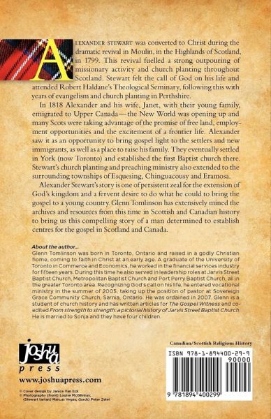 Alexander Stewart was converted to Christ during the dramatic revival in Moulin, in the Highlands of Scotland, in 1799. This revival fuelled a strong outpouring of missionary activity and church planting throughout Scotland. Stewart felt the call of God on his life and attended Robert Haldane's Theological Seminary, following this with years of evangelism and church planting in Perthshire. In 1818 Alexander and his wife, Janet, with their young family, emigrated to Upper Canada-the New World was opening up and many Scots were taking advantage of the promise of free land, employment opportunities and the excitement of a frontier life. Alexander saw it as an opportunity to bring gospel light to the settlers and new immigrants, as well as a place to raise his family. They eventually settled in York (now Toronto) and established the first Baptist church there. Stewart's church planting and preaching ministry also extended to the surrounding townships of Esquesing, Chinguacousy and Eramosa. Alexander Stewart's story is one of persistent zeal for the extension of God's kingdom and a fervent desire to do what he could to bring the gospel to a young country. Glenn Tomlinson has extensively mined the archives and resources from this time in Scottish and Canadian history to bring us this compelling story of a man determined to establish centres for the gospel in Scotland and Canada.