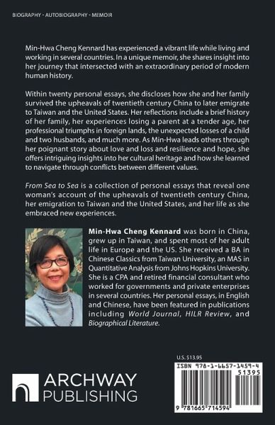 Min-Hwa Cheng Kennard has experienced a vibrant life while living and working in several countries. In a unique memoir, she shares insight into her journey that intersected with an extraordinary period of modern human history. Within twenty personal essays, she discloses how she and her family survived the upheavals of twentieth century China to later emigrate to Taiwan and the United States. Her reflections include a brief history of her family, her experiences losing a parent at a tender age, her professional triumphs in foreign lands, the unexpected losses of a child and two husbands, and much more. As Min-Hwa leads others through her poignant story about love and loss and resilience and hope, she offers intriguing insights into her cultural heritage and how she learned to navigate through conflicts between different values. From Sea to Sea is a collection of personal essays that reveal one woman's account of the upheavals of twentieth century China, her emigration to Taiwan and the United States, and her life as she embraced new experiences.