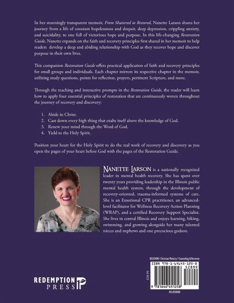 In her stunningly transparent memoir, From Shattered to Restored, Nanette Larson shares her journey from a life of constant hopelessness and despair, deep depression, crippling anxiety, and suicidality, to one full of victorious hope and purpose. In this life-changing Restoration Guide, Nanette expands on the faith and recovery principles first shared in her memoir to help readers develop a deep and abiding relationship with God as they recover hope and discover purpose in their own lives. This companion Restoration Guide offers practical application of faith and recovery principles for small groups and individuals. Each chapter mirrors its respective chapter in the memoir, utilizing study questions, points for reflection, prayers, pertinent Scripture, and more. Through the teaching and interactive prompts in the Restoration Guide, the reader will learn how to apply four essential principles of restoration that are continuously woven throughout the journey of recovery and discovery: 1.Abide in Christ. 2.Cast down every high thing that exalts itself above the knowledge of God. 3.Renew your mind through the Word of God. 4.Yield to the Holy Spirit. Position your heart for the Holy Spirit to do the real work of recovery and discovery as you open the pages of your heart before God with the pages of the Restoration Guide.