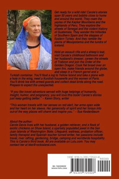 Get ready for a wild ride! Carole's stories span 50 years and bobble close to home and around the world. They roam the yaylas of the Kaçkar Mountains and the highlands of Peru. They explore the streets of Senegal and the violent history of Guatemala. They wander the hillsides of Southern Spain and the steppes of Eastern Turkey. And they ramble the plains of Mesopotamia and the tundra of Iceland. Hold an assault rifle and a sheep's teat, visit Carole's childhood bathroom and her husband's dresser, careen the streets of Trabzon and join the Order of the Golden Dragon. Cook flat bread over an open fire, make friends around the globe, and sleep in a French garret and a Turkish container. You'll float a log to Yellow Island and take a plane with a hole in the wing, meet a Kurdish housewife and the women of Paris. You'll drink tea with armed guards and collect dead birds along the road. Prepare to expect the unexpected.