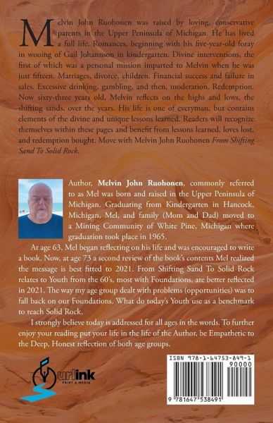 Author, Melvin John Ruohonen, commonly referred to as Mel was born and raised in the Upper Peninsula of Michigan. Graduating from Kindergarten in Hancock, Michigan, Mel, and family (Mom and Dad) moved to a Mining Community of White Pine, Michigan where graduation took place in 1965. At age 63, Mel began reflecting on his life and was encouraged to write a book. Now, at age 73 a second review of the book's contents Mel realized the message is best fitted to 2021. From Shifting Sand To Solid Rock relates to Youth from the 60's, most with Foundations, are better reflected in 2021. The way my age group dealt with problems (opportunities) was to fall back on our Foundations. What do today's Youth use as a benchmark to reach Solid Rock. I strongly believe today is addressed for all ages in the words. To further enjoy your reading put your life in the life of the Author, be Empathetic to the Deep, Honest reflection of both age groups.