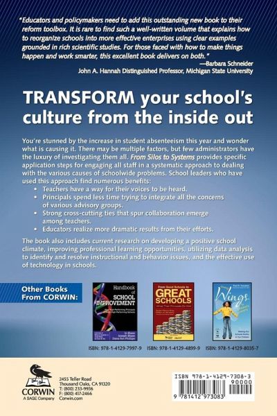 Transform your school's culture from the inside out You're stunned by the increase in student absenteeism this year and wish you had the luxury of investigating all of the possible causes. From Silos to Systems provides specific application steps for engaging all staff in a systematic approach to dealing with the various causes of schoolwide problems. School leaders who have used this approach find numerous benefits: Teachers have a way for their voices to be heard Principals spend less time integrating all the concerns of various advisory groups Educators realize more dramatic results from their efforts
