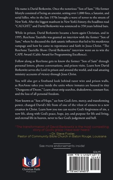 His name is David Berkowitz. Once the notorious "Son of Sam." His former lifestyle consisted of being an arsonist, setting over 1,000 fires, a Satanist, and serial killer, who in the late 1970s brought a wave of terror to the streets of New York. After the biggest manhunt in New York's history, the headlines read "caught," and David Berkowitz was sentenced to 350 years behind bars. While in prison, David Berkowitz became a born-again Christian, and in 1995, RoxAnne Tauriello was granted an interview with the former "Son of Sam," where he discussed the dark satanic influences that led to his murderous rampage and how he came to repentance and faith in Jesus Christ. "The RoxAnne Tauriello Show: David Berkowitz" interview went on to win the CAPE Award (Cable Award for Programming Excellence). Follow along as RoxAnne gets to know the former "Son of Sam" through personal letters, phone conversations, and prison visits. Learn how David Berkowitz serves the Lord in prison and around the world, and read amazing ministry accounts of victory through Jesus Christ. You will also get a firsthand look behind razor wire and prison walls, as RoxAnne takes you inside the units where inmates are housed in tiny "Dungeons of Doom." Learn about strip searches, shakedowns, constant fear, and the loss of all personal freedom. Now known as "Son of Hope," see how God's love, mercy, and transforming power, changed David's life from of one of the vilest of sinners to a new creation in Christ. Learn how you too can receive God's forgiveness of sin, a new life, along with God's peace, hope, joy, and purpose for life and living, and eternal life in heaven, never to face God's judgement and hell. DISCLOSURE: David Berkowitz receives no compensation from sales of this book.