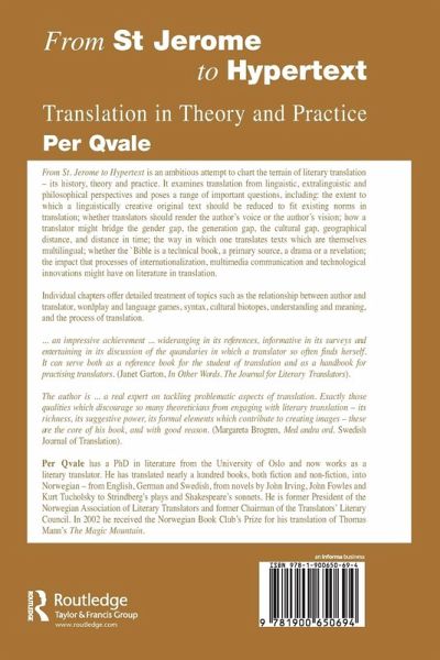 From St. Jerome to Hypertext is an ambitious attempt to chart the terrain of literary translation - its history, theory and practice. It examines translation from linguistic, extralinguistic and philosophical perspectives and poses a range of important questions, including: the extent to which a linguistically creative original text should be reduced to fit existing norms in translation; whether translators should render the author's voice or the author's vision; how a translator might bridge the gender gap, generation gap, cultural gap, geographical distance, and distance in time; the way in which one translates texts which are themselves multilingual; whether the Bible is a technical book, a primary source, a drama or a revelation; the impact that processes of internationalization, multimedia communication and technological innovations might have on literature in translation. Individual chapters offer detailed treatmemnt of topis such as the relationship between author and translator, wordplay and language games, syntax, cultural biotes, understanding and meaning, and the process of translation.
