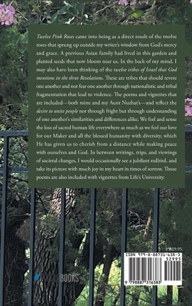 Twelve Pink Roses came into being as a direct result of the twelve roses that sprung up outside my writer's window from God's mercy and grace. A previous Asian family had lived in this garden and planted seeds that now bloom near us. In the back of my mind, I may also have been thinking of the twelve tribes of Israel that God mentions in the three Revelations. These are tribes that should revere one another and not fear one another through nationalistic and tribal fragmentation that lead to violence. The poems and vignettes that are included--both mine and my Aunt Nuzhat's--and reflect the…mehr