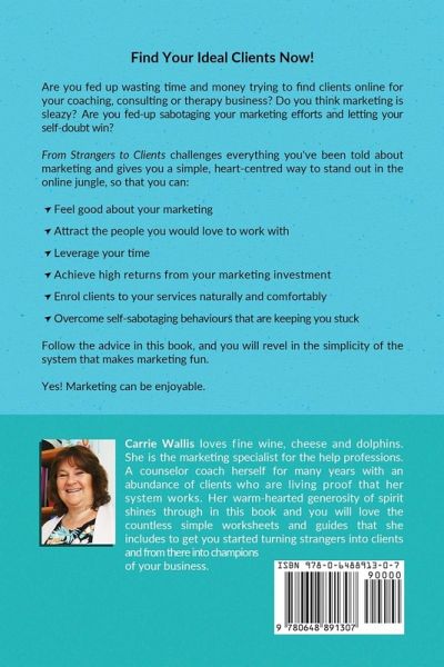 Find Your Ideal Clients Now! Are you fed up wasting time and money trying to find clients online for your coaching, consulting or therapy business? Do you think marketing is sleazy? Are you fed-up sabotaging your marketing efforts and letting your self-doubt win? In this practical and action-orientated book, Carrie Wallis presents an ethical heart-centred way to stand out in the crowded online space. Creating a path that brings people you love to work with straight to your door. Reveal an effortless way to enroll strangers as clients that feels comfortable and fun. Learn how to quiet self-doubt and remove beliefs that have limited and sabotaged your chances for success. Many small business owners in the help professions fear sales and hate the idea of marketing. They fear being perceived as 'salesy' or harassing. Marketing feels overwhelming with so many paths to choose from, and so much expensive technology to use. Professionals worry that no one will want to pay to work with them when there are so many coaches, consultants, counselors available. They fear the time it will take to build credibility online and worry about wasting money on adverts that yield poor results. From Strangers to Clients busts those myths and challenges everything you've been told about marketing. From Strangers to Clients gives you a simple path to find clients online, so that you can: · Feel good about your marketing · Attract the people you'd love to work within your service · Save you time and marketing spend · Leverage your time, leaving you free to do what you got into practice for - help and serve your clients · Achieve high returns on your marketing investment · Use your therapeutic skills as part of the marketing process · Enroll clients with a natural and comfortable process · Overcome self-sabotaging behaviours that are keeping you stuck with few clients Follow the advice in this book, and you will revel in the simplicity of the system that makes marketing fun. Yes! Marketing can be enjoyable. What's stopping you from finding clients online? Want to find a way to silence the inner critic that is currently blocking your client-attraction efforts? "Scroll to the top and click the "buy now" button."