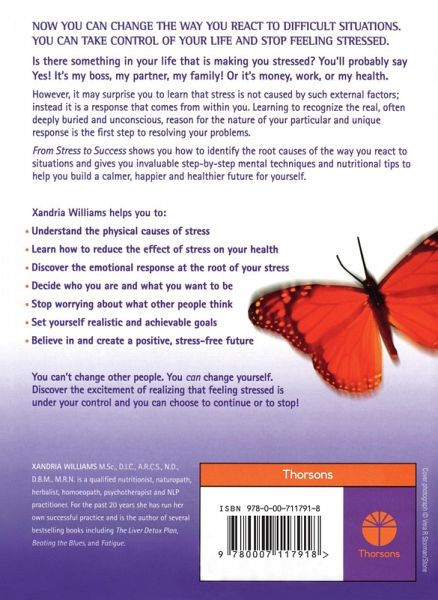 Now you can change the way you react to difficult situations. You can take control of your life and stop feeling stressed. Is there something in your life that is making you stressed? You'll probably say Yes! It's my boss, my partner, my family! Or its money, work or my health. However it may surprise you to learn that stress is not caused by such external factors; instead it is a response that comes from within you. Learning to recognise the real, often deeply buried and unconscious, reason for the nature of you particular and unique response is the first step to resolving your problems. 'From Stress to Success' shows you how to identify the root causes of the way you react to situations and gives you invaluable step by step mental techniques and nutritional tips to help you build a calmer, happier and healthier future for yourself. Xandria Williams helps you to: ¿ Understand the physical causes of stress on your health ¿ Discover the emotional response at the root of your stress ¿ Decide who you are and what you want to be ¿ Stop worrying about what other people think ¿ Set yourself realistic and achievable goals ¿ Believe in and create a positive, stress-free future You can't change other people. You 'can' change yourself. Discover the excitement of realising that feeling stressed is under your control and you can choose to continue or to stop