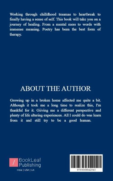 Working through childhood traumas to heartbreak to finally having a sense of self. This book will take you on a journey of healing. From a mental mess to words with immense meaning. Poetry has been the best form of therapy.