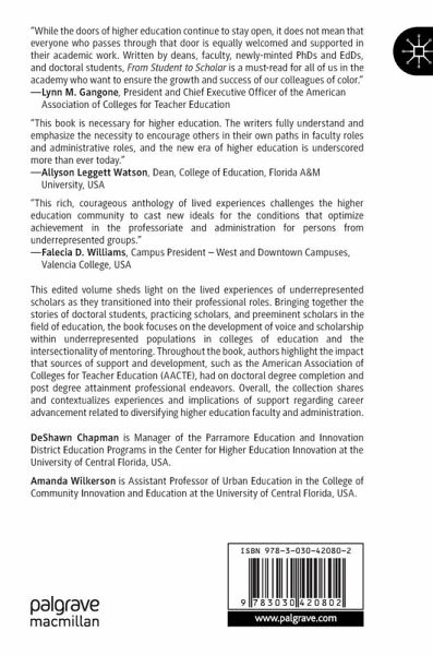 This edited volume sheds light on the lived experiences of underrepresented scholars as they transitioned into their professional roles. Bringing together the stories of doctoral students, practicing scholars, and preeminent scholars in the field of education, the book focuses on the development of voice and scholarship within underrepresented populations in colleges of education and the intersectionality of mentoring. Throughout the book, authors highlight the impact that sources of support and development, such as the American Association of Colleges for Teacher Education (AACTE), had on doctoral degree completion and post degree attainment professional endeavors. Overall, the collection shares and contextualizes experiences and implications of support regarding career advancement related to diversifying higher education faculty and administration.