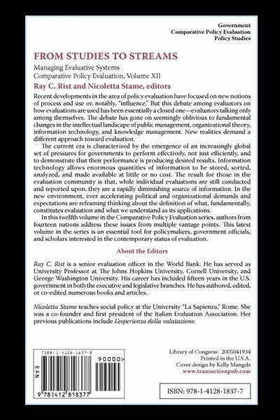 Recent developments in policy evaluation have focused on new notions of process and use or, notably, "influence." But this debate among evaluators on how evaluations are used has been essentially a closed one-evaluators talking only among themselves. The debate has gone on seemingly oblivious to fundamental changes in the intellectual landscape of public management, organizational theory, information technology, and knowledge management. New realities demand a different approach toward evaluation. The current era is characterized by the emergence of an increasingly global set of pressures for governments to perform effectively, not just efficiently, and to demonstrate that their performance is producing desired results. Information technology allows enormous quantities of information to be stored, sorted, analyzed, and made available at little or no cost. The result for those in the evaluation community is that, while individual evaluations are still conducted and reported upon, they are a rapidly diminishing source of information. In the new environment, ever accelerating political and organizational demands and expectations are reframing thinking about the definition of what, fundamentally, constitutes evaluation and what we understand as its applications. In this twelfth volume in the Comparative Policy Evaluation series, authors from fourteen nations address these issues from multiple vantage points. From Studies to Streams is an essential tool for policymakers, government officials, and scholars interested in the contemporary status of evaluation.
