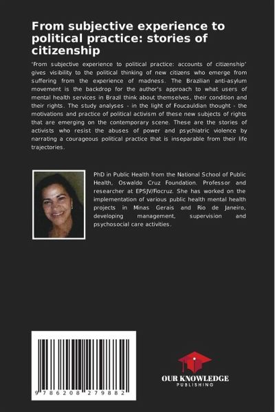 'From subjective experience to political practice: accounts of citizenship' gives visibility to the political thinking of new citizens who emerge from suffering from the experience of madness. The Brazilian anti-asylum movement is the backdrop for the author's approach to what users of mental health services in Brazil think about themselves, their condition and their rights. The study analyses - in the light of Foucauldian thought - the motivations and practice of political activism of these new subjects of rights that are emerging on the contemporary scene. These are the stories of activists who resist the abuses of power and psychiatric violence by narrating a courageous political practice that is inseparable from their life trajectories.