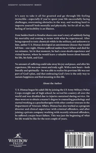 It's easy to take it all for granted and go through life feeling invincible-especially if you've spent your life successfully facing challenges, overcoming obstacles in the way, and working hard to improve yourself both mentally and physically. Yet for all of us, this feeling of invincibility is an illusion. From Sudden Death to Paradise shares one man's story of suddenly facing his mortality and coming to terms with what he experienced. After being exposed to toxic chemicals while in the military, and unknown to him, author T. S. Dismas developed an autoimmune disease that would kill him-one night, Dismas suffered sudden heart failure and died for ten minutes. Yet in that moment, he had a near-death experience and visited heaven, where he would learn a valuable lesson about himself, his life, his faith, and God. No amount of suffering could take away his joy and peace, and after his experience, life was now sweet and truly a gift. With a new heart-both literally and spiritually-he was able to realize his previous life was not part of God's plan, and that embracing God's love is the only way to sustain happiness and find meaning in this life.