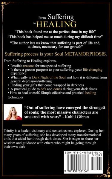 Why do bad things happen to good people? Why does your Life journey lead you to suffer? The Answer is to Heal You. Your suffering is the epitome of a blessing in disguise. Wrapped in darkness and suffering, it removes the ground from beneath your feet and leaves you fearful, fragile and devoid of meaning in life. The caterpillar is born with everything it needs, internally and externally, to become the butterfly. You are born with everything you need, inside of you and in your outside world, to become the next version of yourself. The caterpillar suffers a death of itself inside the cocoon. This is the same shedding you do when you pass through a dark time of suffering in your soul and reboot to your true self. Most beings that we adore or worship have gone through dark times in their life. This includes Christ, Buddha, Gandhi, Nelson Mandela, Oprah, Abraham Lincoln etc. This process is necessary as it re-defines a person, re-makes one character, chips away the darkness to bring out the luster of your Real Self. This is your METAMORPHOSIS. From Suffering to Healing explores..Possible reason for your unexpected suffering Is there a greater purpose to your suffering, your life-changing experience What really is Dark Night of the Soul and how it is different from general depression/suffering Finding your gifts that come wrapped in darkness A practical guide to do's and don'ts during your dark times How to heal oneself. Simple effective and practical healing techniques If you're ready to become the best version of yourself and shed the parts that no longer serve you, look no further, your Answers are here. Our wounds are often the openings into the best and the most beautiful parts of us. - David Rich