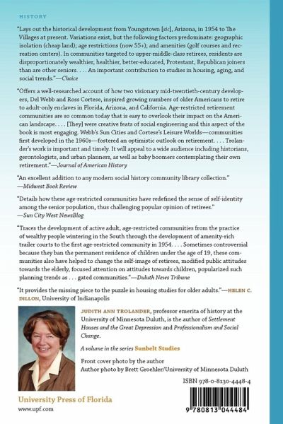 Youngtown, Arizona, opened in 1954 and was the first development community to have a minimum age requirement (then 65) and to ban underage children as permanent residents. Developer Del Webb unveiled Sun City six years later. Adjacent to Youngtown, it offered modest homes abutting a golf course. In the ensuing decades, active adult communities have proliferated, including Harold Schwartz’s "The Villages" in central Florida, today the nation’s single largest retirement community. For nearly sixty years, the success of these and similar communities have changed the image of retirees from frail, impoverished old people to energetic, well-off adults enjoying a resort-like lifestyle. While some experts predicted these communities would fail or undermine the obligations between generations, they are now firmly embedded as one possible extension of the American dream. Judith Ann Trolander has written the first book-length history of the "active adult" lifestyle. Examining the origins, development, failures, and challenges facing these communities as the baby boomer population continues to age, she offers a truly original defense of a sometimes controversial aspect of American life.