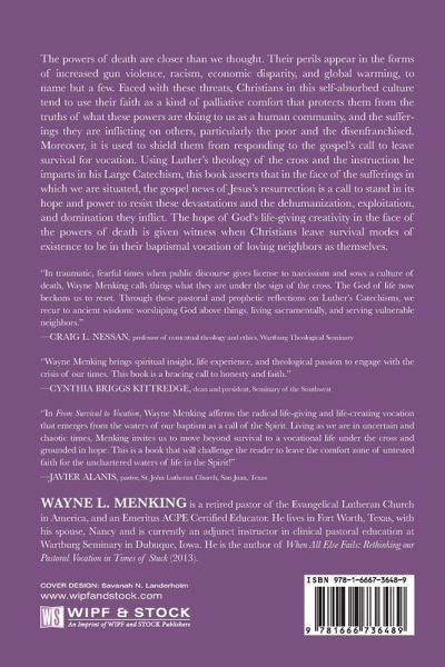 The powers of death are closer than we thought. Their perils appear in the forms of increased gun violence, racism, economic disparity, and global warming, to name but a few. Faced with these threats, Christians in this self-absorbed culture tend to use their faith as a kind of palliative comfort that protects them from the truths of what these powers are doing to us as a human community, and the sufferings they are inflicting on others, particularly the poor and the disenfranchised. Moreover, it is used to shield them from responding to the gospel's call to leave survival for vocation. Using Luther's theology of the cross and the instruction he imparts in his Large Catechism, this book asserts that in the face of the sufferings in which we are situated, the gospel news of Jesus's resurrection is a call to stand in its hope and power to resist these devastations and the dehumanization, exploitation, and domination they inflict. The hope of God's life-giving creativity in the face of the powers of death is given witness when Christians leave survival modes of existence to be in their baptismal vocation of loving neighbors as themselves.